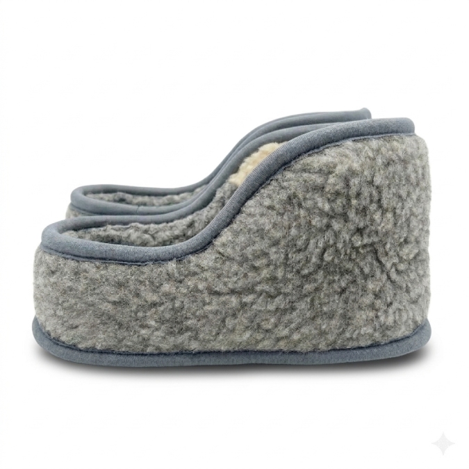 Between the sole and the wool insole is a 1.5 cm foam layer that cushions each step, reduces pressure, and provides extra protection from cold floors.